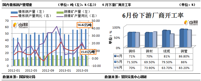 供需方面,过去一个月,全球多个主要铜矿厂商平稳渡过前期矿难、减产事件,全球铜矿供给增加,现货铜加工精炼费相应上涨。相比之下,国内铜市进入传统淡季,订单下滑,企业开工持续走低。流动性方面,预计出于经济复苏和美元升值压力的考虑,8月伯南克继续力挺QE概率大。