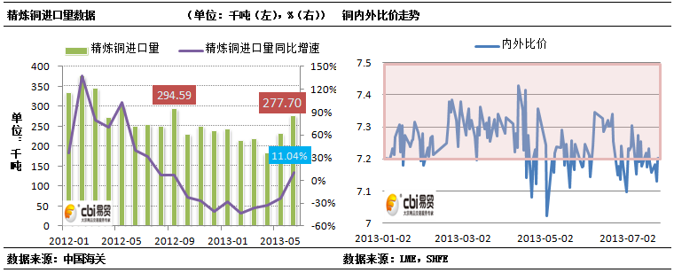中国6月份精炼铜进口量为27.7万吨,同比增长11.04%,较5月份的23.2万吨增加4.5万吨,为年内首次同比正增长,创2012年三季度以来新高。6月份国内银行业出现了“钱荒”现象,促成融资铜贸易资金收益率上升,此外6月份沪伦比值修复至7.2附近,套利窗口再次打开。这两点都利好融资铜贸易。