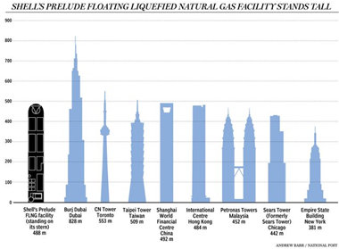 前奏号是由全球能源巨头壳牌公司建造的一个488米长的浮动天然气加工平台。该平台项目于2011年获得批准2012年开始建设,是全球首个海上浮动天然气加工设施。